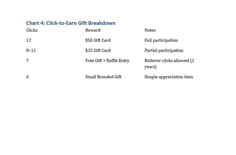 - 8 clicks = $25. 6–7 clicks = small gift. 7+ clicks = automatic raffle entry.